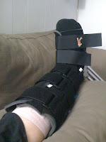 So…I had to wear this lovely boot for two weeks. The second picture is Mike’s attempt at wrapping my foot with a blanket and ice underneath. I was not allowed to take the boot off for two weeks, so we got creative.