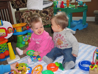 Oh I just love how these two interact. It was one of the first times that I put her down at someone’s home that was not ours and she didn’t cry! YAY!! Are we at the end of her separation anxiety? Or is it just that she thinks this little boy is ADORABLE!! I am hoping for both 🙂 Thanks for the great play date Crew and Lisa!!